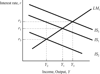 (Exhibit: ISLM Monetary Policy) Based on the graph, starting from equilibrium at interest rate r1 and income Y1, an increase in the money supply would generate the new equilibrium combination of interest rate and income: